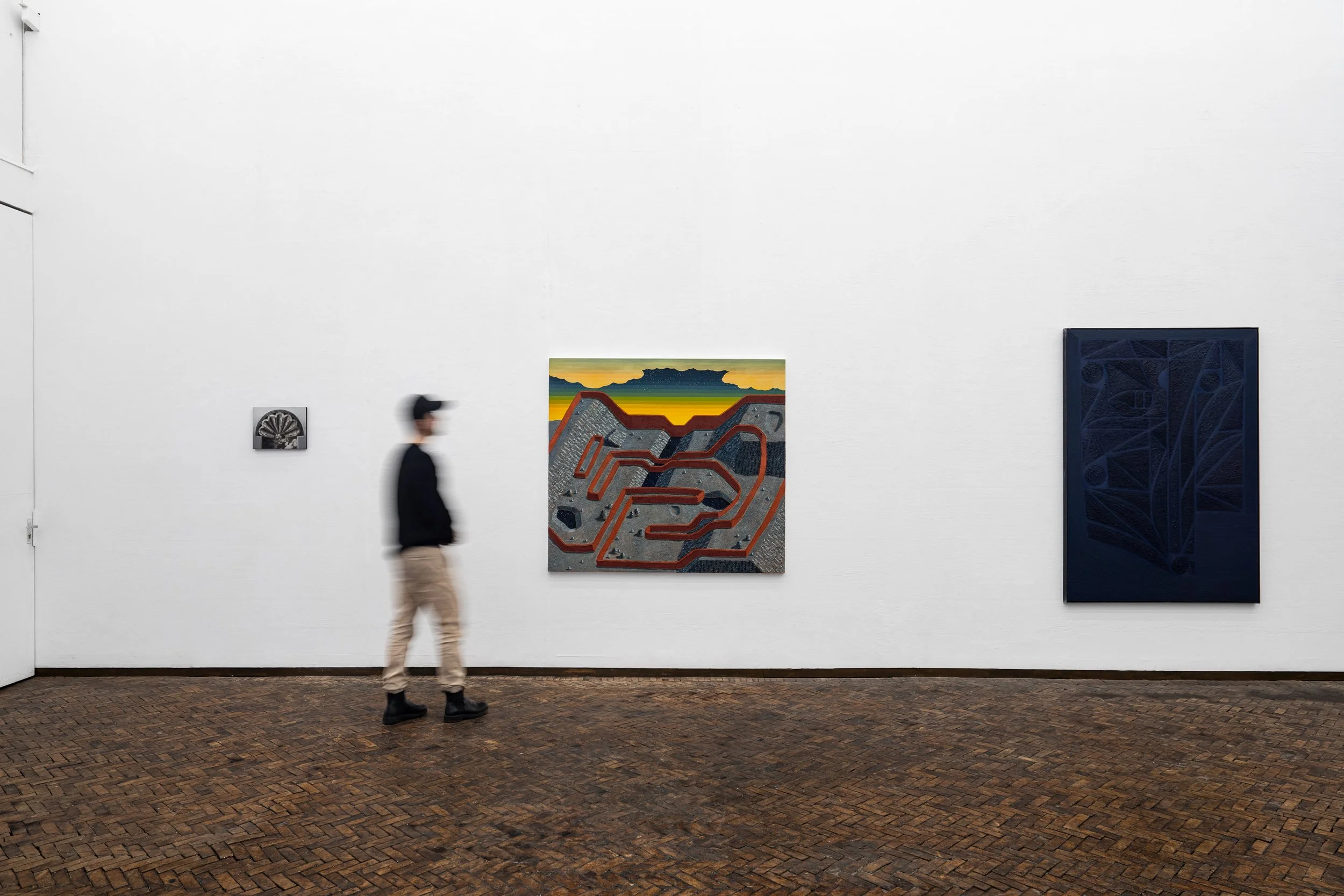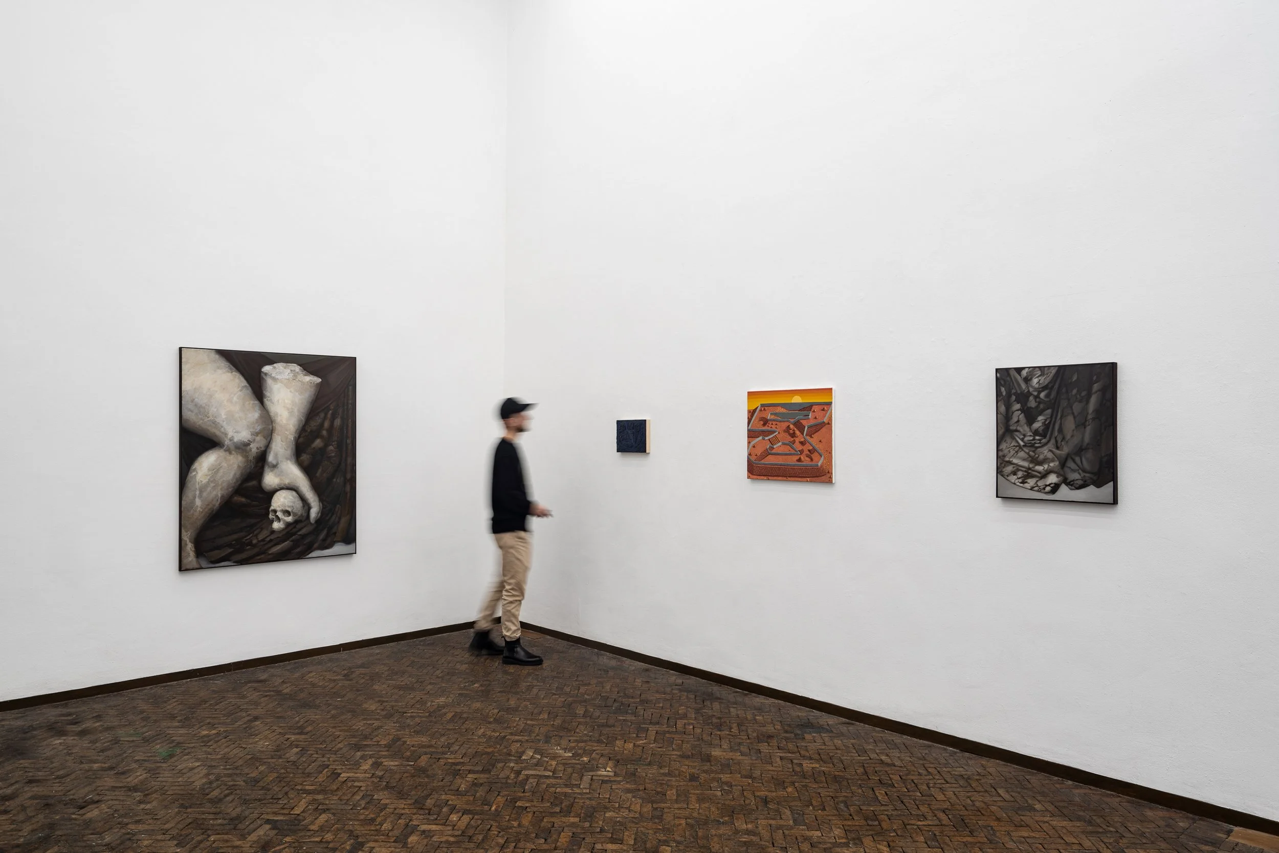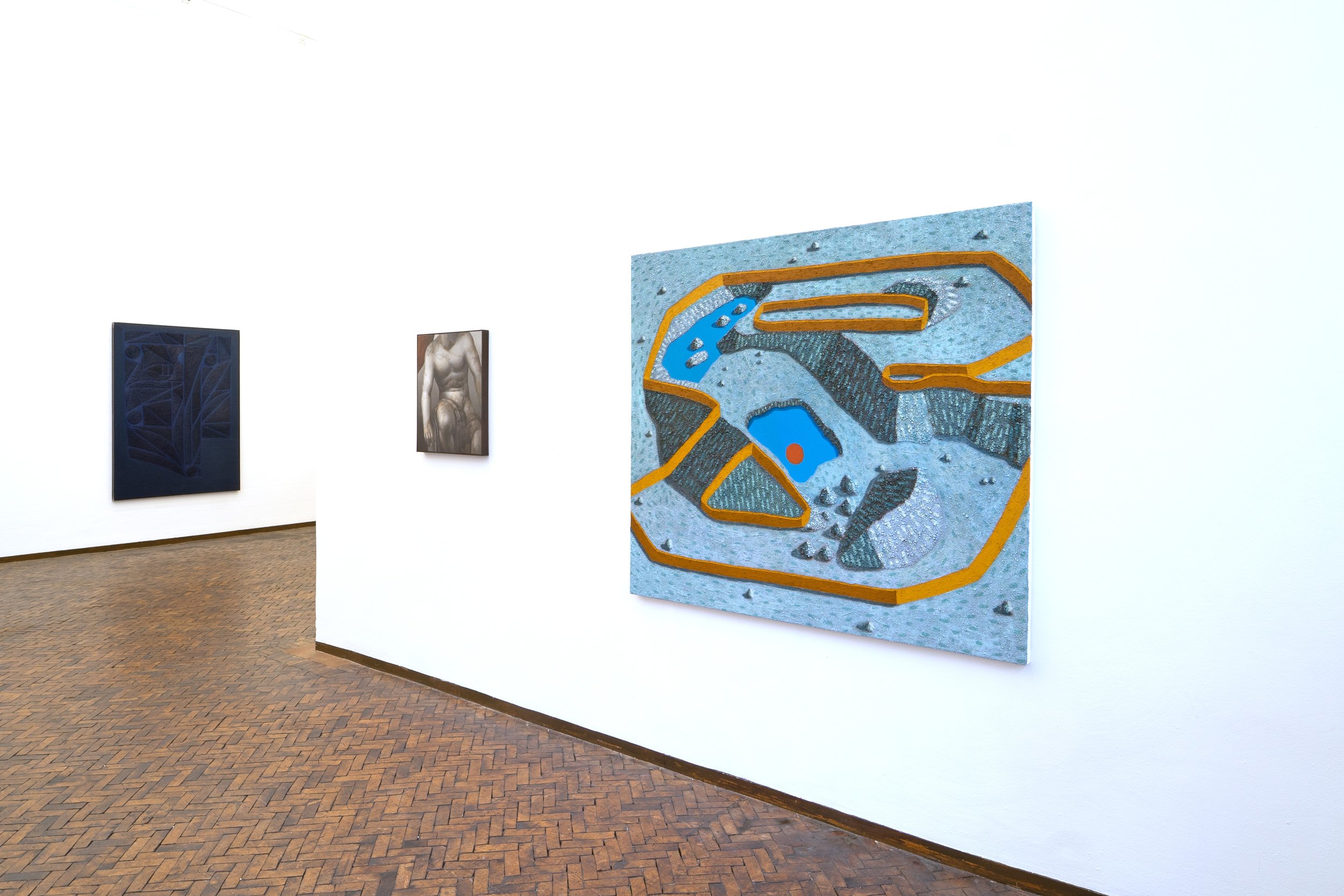 Physically, the works in the show, and the space in which they are shown, create an environment where the mind must grapple with whether or not the paintings depict civilisations of the future or of the past. The works themselves refuse to be placed in a certain time period , while referencing historical motifs, philosophies and themes, they stand imbued with contemporary technique and thinking.