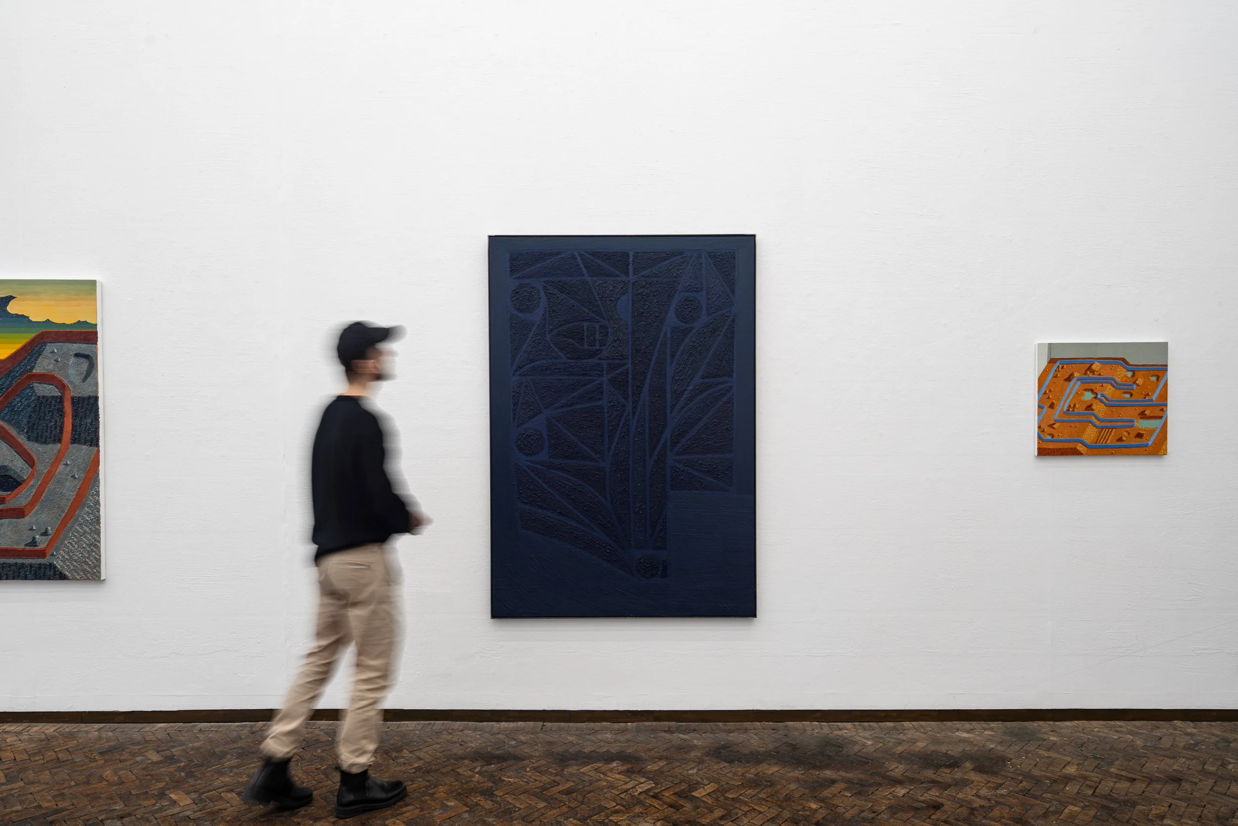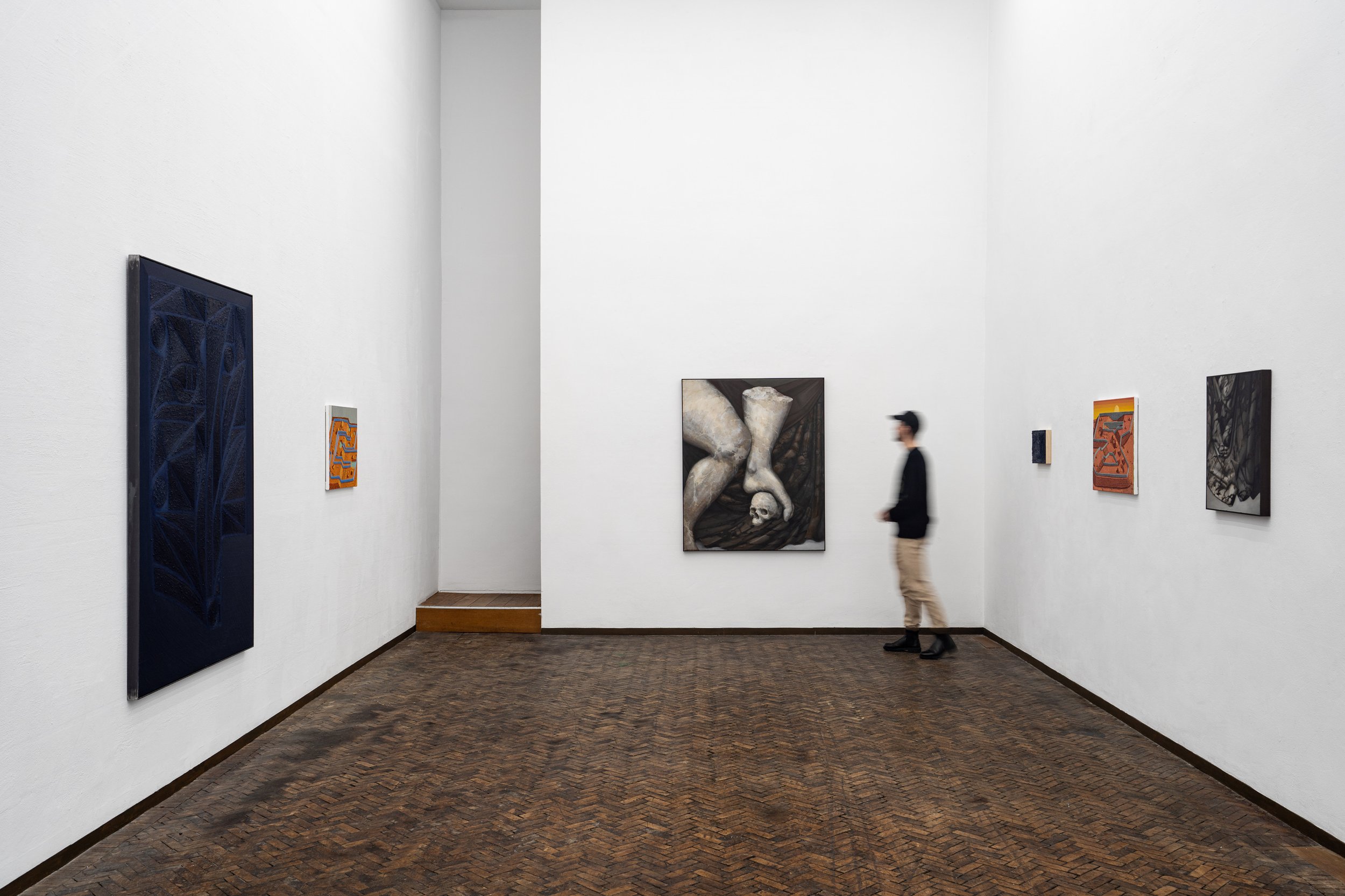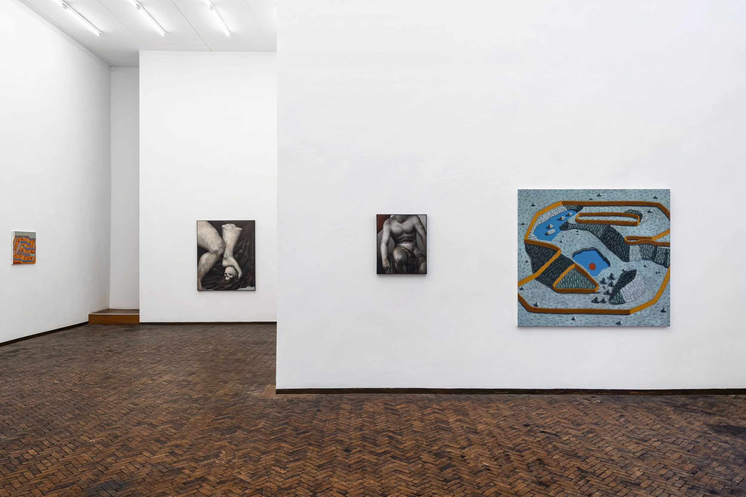 Physically, the works in the show, and the space in which they are shown, create an environment where the mind must grapple with whether or not the paintings depict civilisations of the future or of the past. The works themselves refuse to be placed in a certain time period , while referencing historical motifs, philosophies and themes, they stand imbued with contemporary technique and thinking.